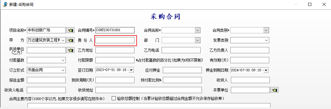 2、采購(gòu)合同新建時(shí),責(zé)任人留空,不再帶入上次記錄內(nèi)容。
